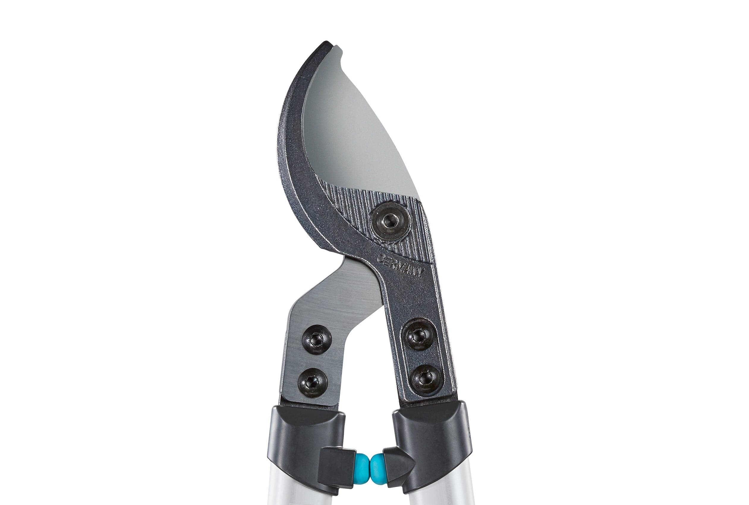 The GARDENA PremiumCut 700 B Pruning Loppers deliver a clean cut on trees and shrubs. At just under 1.3 kg, these loppers are light and easy to work with. The low weight combined with the integrated end-stop buffer made of special plastic reduce shocks when cutting, which is easy on your wrists. The double-curved aluminium handles make the shears not only sturdy, but also comfortable to hold thanks to the ergonomically shaped grips. The professional loppers are equipped with an upper blade made of special steel and a forged lower blade; both elements are particularly durable. The blades are precision-ground and work according to the bypass cutting principle. This means that they slide past each other when cutting and make a clean, precise cut that is gentle on the fresh wood. GARDENA provides a 25-year warranty on the pruning shears produced in Germany, which is even more proof that you are getting a real quality product with the PremiumCut. Express your vision with precision.