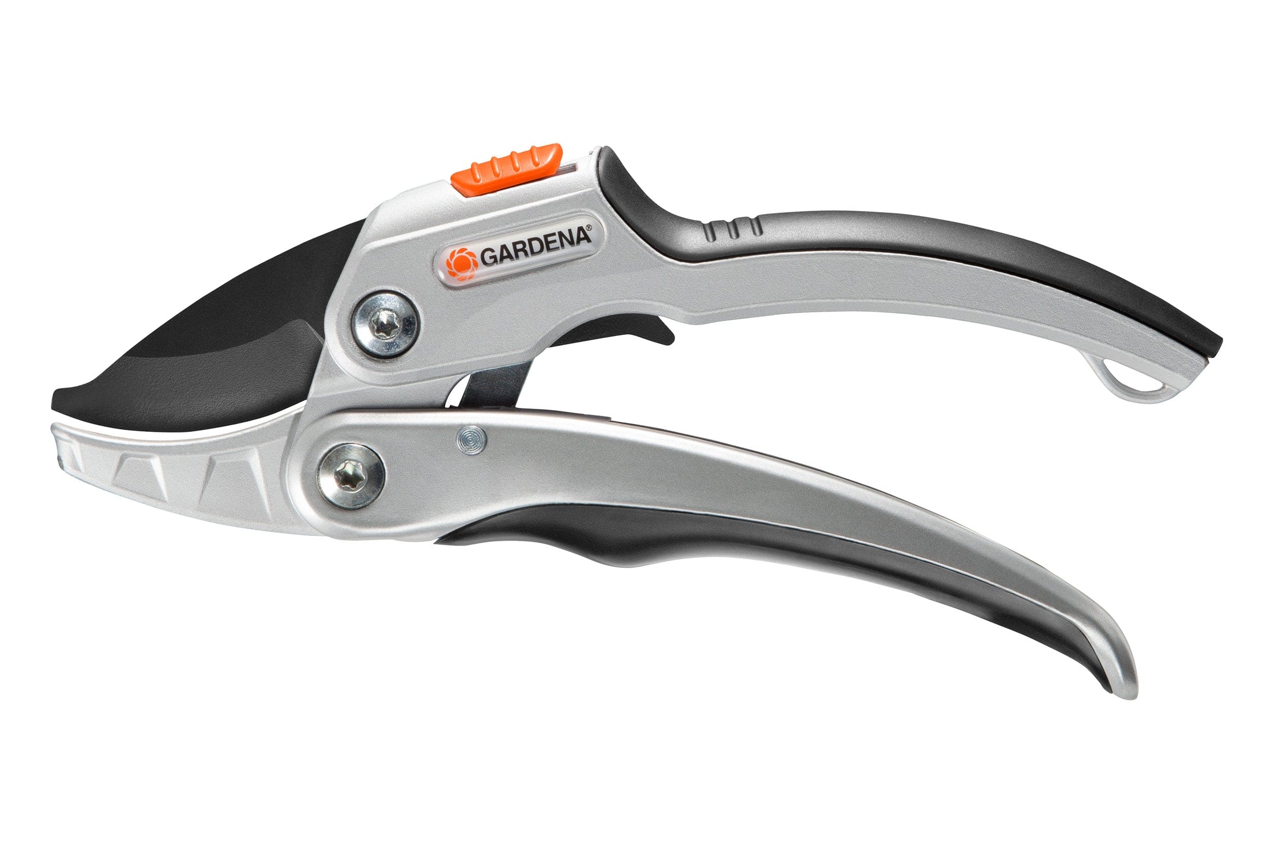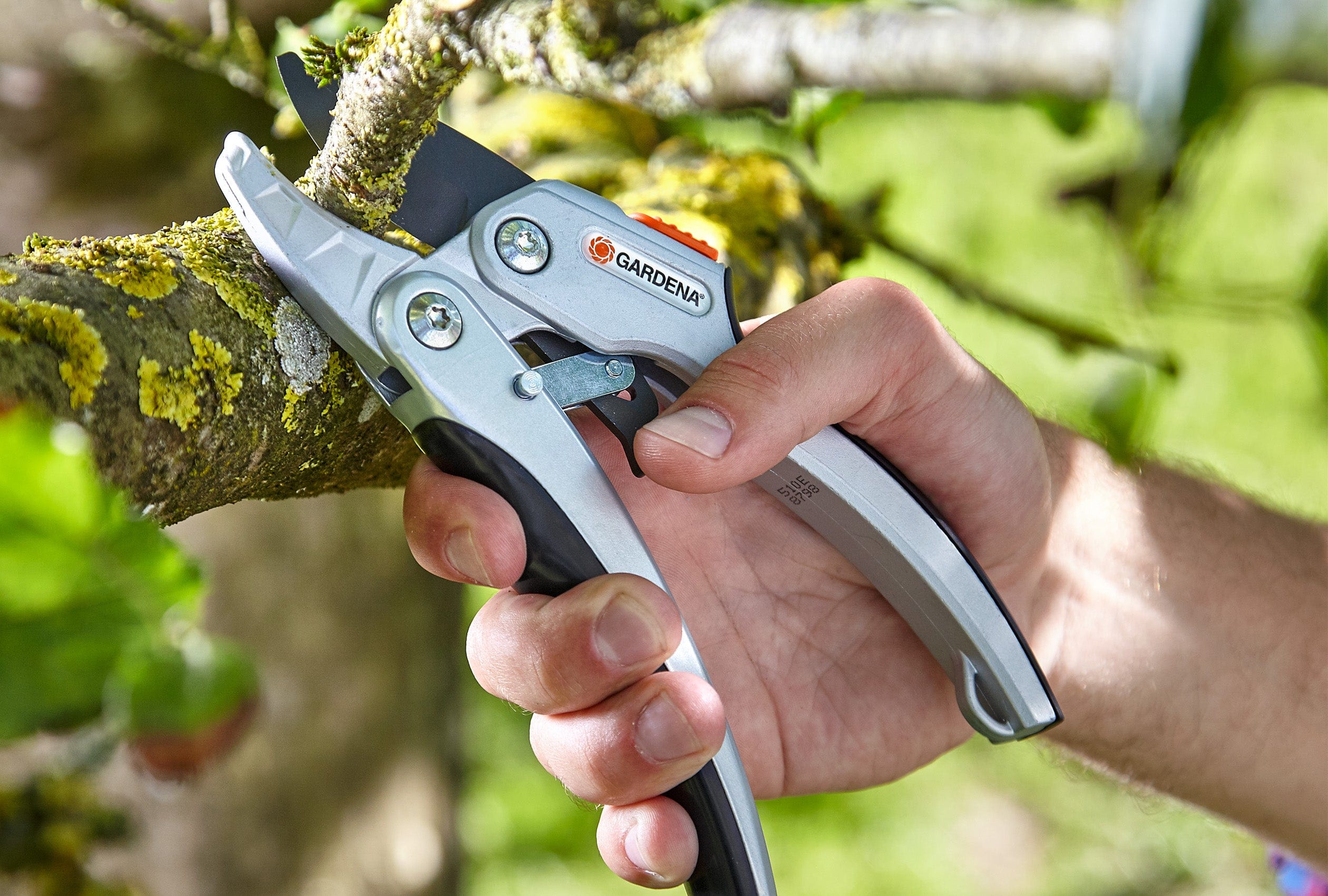The GARDENA Ratchet Secateurs SmartCut Comfort with 25 mm cutting diameter will be a great help for cutting stronger twigs and branches as well as dry wood. The secateurs are equipped with ErgoTec handles made of sturdy aluminium and soft grip. This makes the SmartCut fit comfortably in your hand with any slipping. The clever, automatic SmartCut function provides you with 2 times more power when cutting. This means that you can even cut through thicker branches. The secateurs use the anvil cutting principle and have a precision-ground and non-stick coated blade. This ensures a clean cut that is gentle on your plants. After use, you simply close the secateurs with the single-hand safety lock to store them safely. The Ratchet Secateurs SmartCut Comfort are a quality product made in Germany, GARDENA offers you a manufacturer's warranty of 25 years. Express your vision with precision. Easy to use, effective and durable cutting tools for creative gardeners.