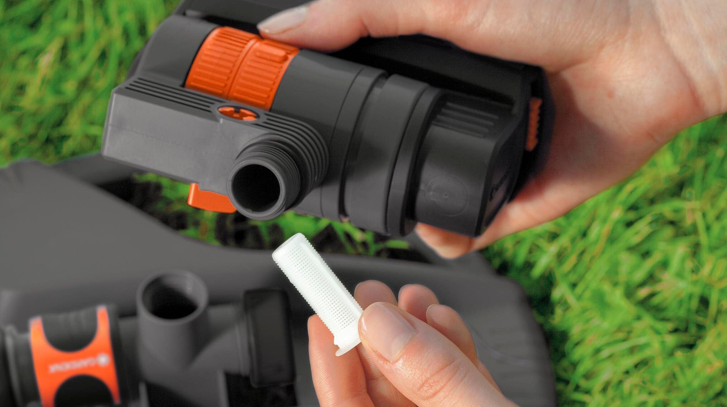 The water connection of the ZoomMax has a filter that prevents dirt particles from entering the oscillating sprinkler. It can be removed so that you can clean it off easily under a tap. Since the spray nozzles are made from soft plastic, any lime deposits can be removed easily by wiping them off with your finger.