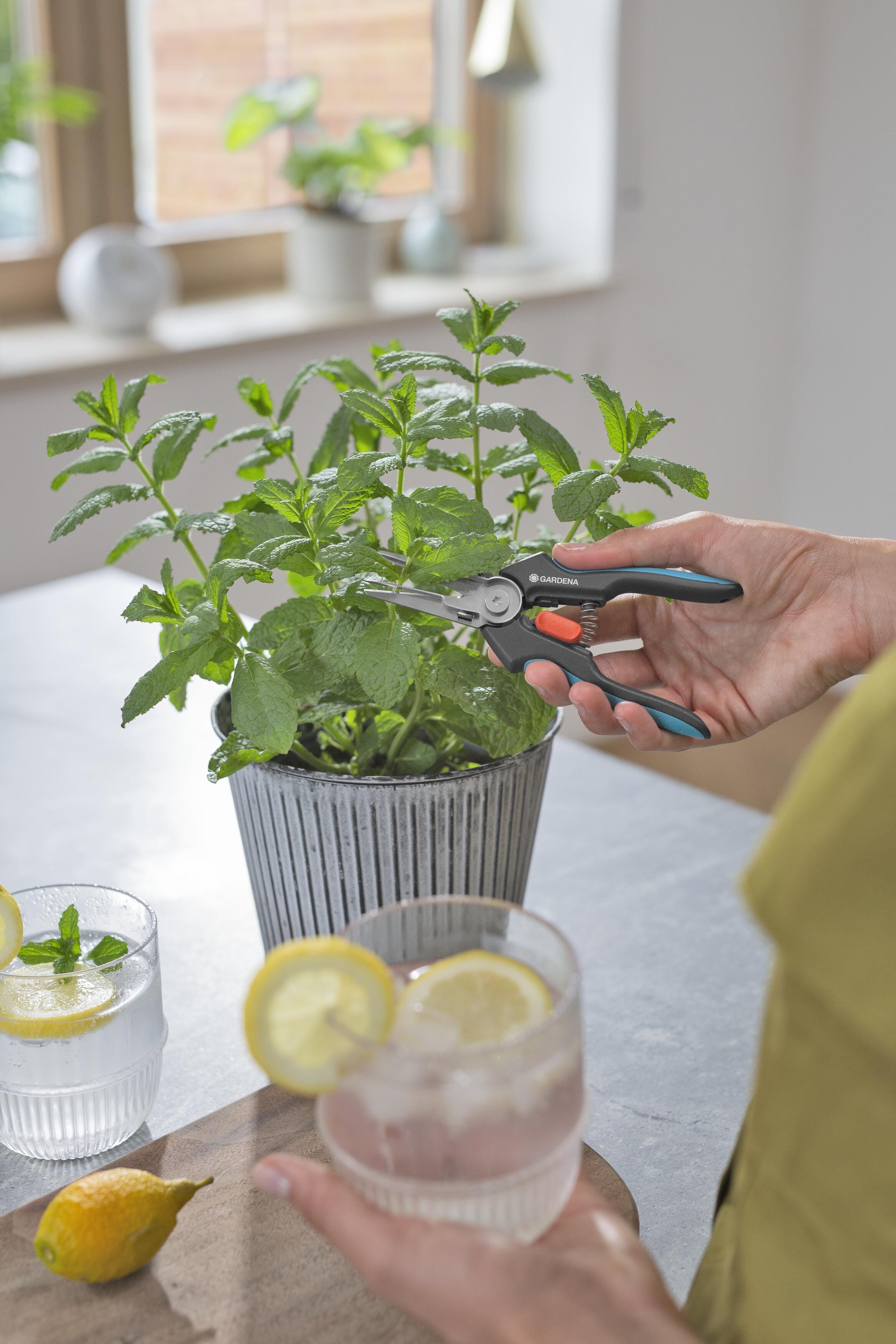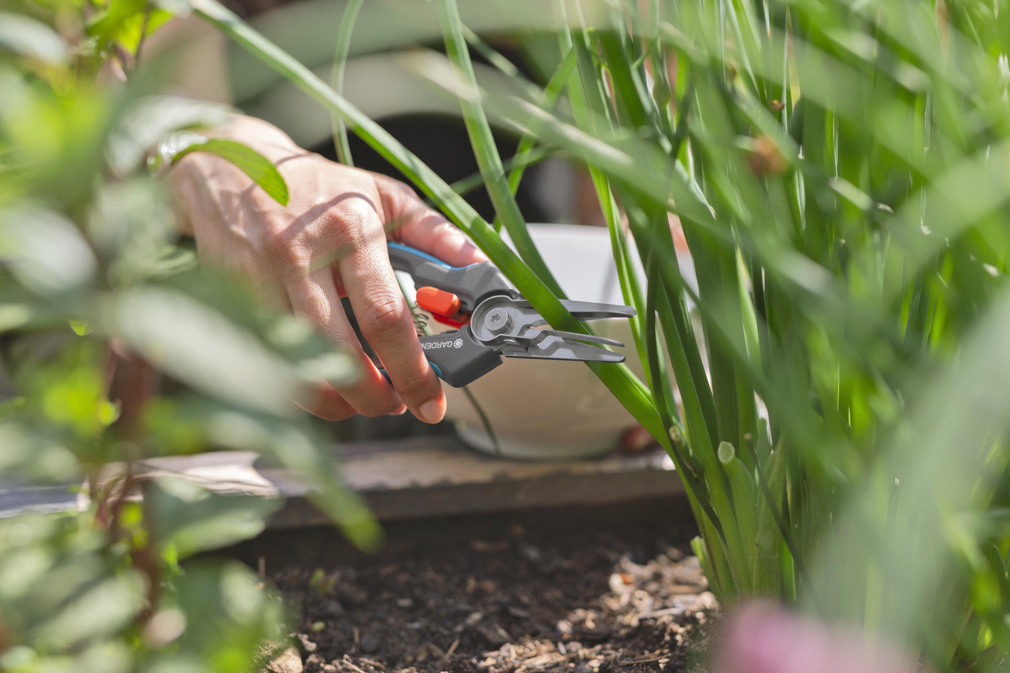The GripCut by GARDENA is equipped with a Gripper and allows you to cut and hold at the same time with just one hand thanks to the built-in holding function. The versatility of the GripCut is extremely useful: Cut fresh herbs such as a sprig of parsley or chives and hold them at the same time. Harvesting chillies in particular is made easier and no spicy juice will get on your fingers. You won't drop any of your harvest, plus you have a free hand to hold a bowl or strainer, meaning you no longer have to keep bending down to put things in a container on the floor. When cutting, the high-quality and durable stainless steel blades are very convincing. With the sharp blades, you can make clean and precise cuts right to the tip. Thanks to the ergonomic ErgoTec handles with soft components, the harvesting scissors fit perfectly in your hand and are non-slip. The one hand locking mechanism helps you safely close the GripCut for storage. The blades are food-safe and do not give off any taste or smell. For easy cleaning, simply disassemble the Gripper first and then put it in the dishwasher together with the GripCut. GARDENA underlines the high quality of the GripCut with its long manufacturer's warranty of 25 years after registration at gardena.com/registration within 3 months after purchase. Handle with care. GARDENA Micro-Cutting. Give your harvest the respect it deserves with our range of precise tools.